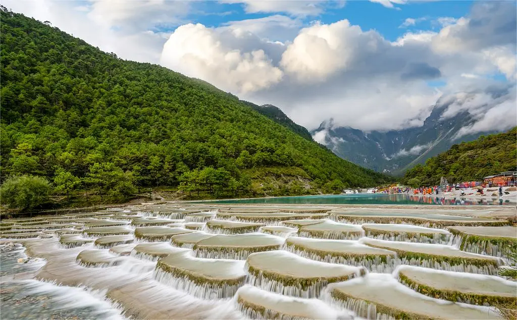 游览➱蓝月谷(游玩约 60 分钟,赠送景区电瓶车)一弯蓝色的月亮浅浅的镶嵌在玉龙雪山脚下,在青山绿树的环抱中看起来是那么的灵动,将玉龙雪山承托的更加美丽。之后,贵宾游览世界文化遗产、国家 AAAAA 景区➱丽江古城 (自由活动)丽江古城内的街道依山傍水修建,以红色角砾岩铺就,有四方街、木府、白沙民居建筑群、 束河民居建筑群等景点,走过石板路,感受四方街的繁华和热闹,体会小桥流水人家的韵味,走进丽江古城,感受纳西风情。