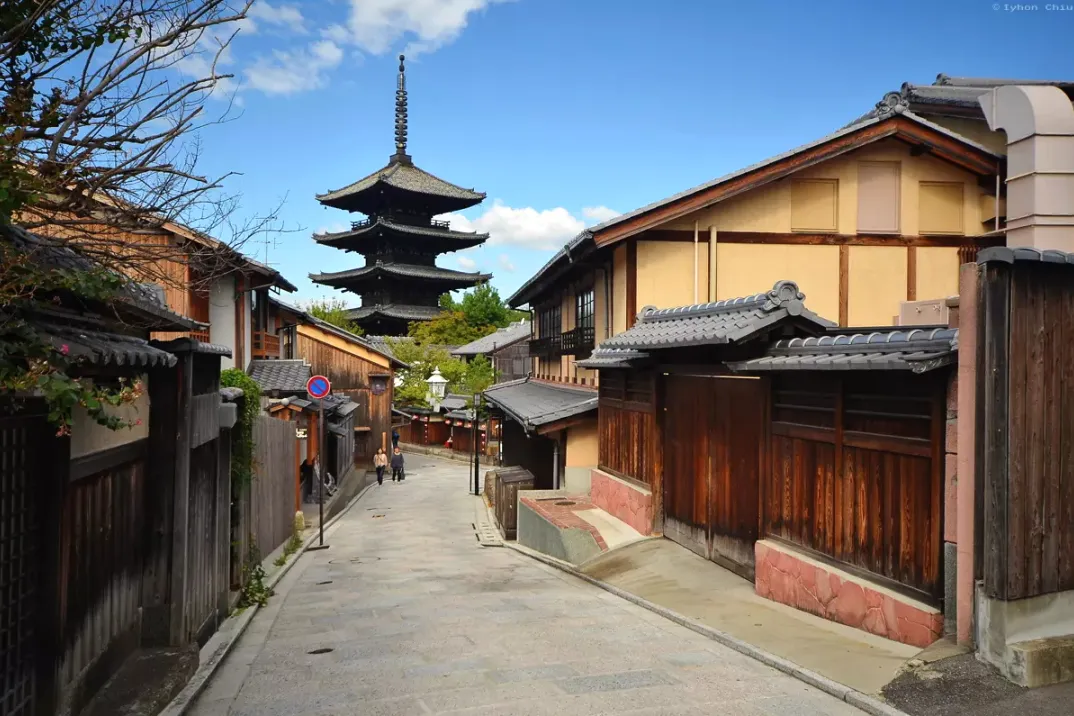 二年坂从北面的高台寺往南延伸至三年坂,长约200米。走在曲径通幽的石板坡道上,一路连绵着保留了红壳格子和虫笼窗式的古老町家建筑,极具韵味。