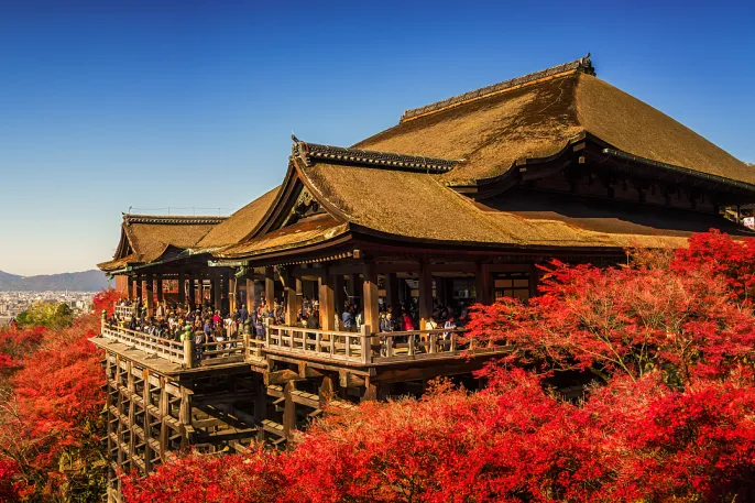 ◈【清水寺】(含大门票)清水寺始建于778年,是京都较为古老的寺院之一,后于1994年被列入世界文化遗产名录。本堂前悬空的清水舞台是日本的珍贵文物,四周绿树环抱,春季时樱花烂漫,是京都的赏樱名所之一,秋季时又化身为赏枫圣地,红枫飒爽,无比壮丽。