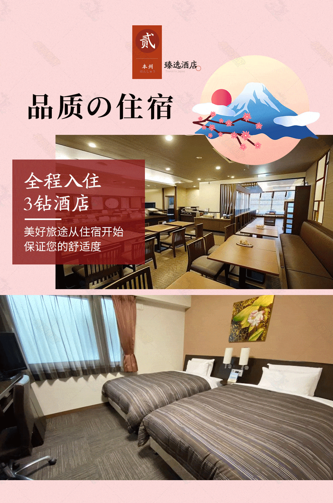 ****温馨提示:日本酒店普遍偏小,因为我们这条日本本州全景游跨日本不同城市,住宿都是根据我们的行程和路程安排的,酒店无法都安排到大城市的市中心,还请您谅解。