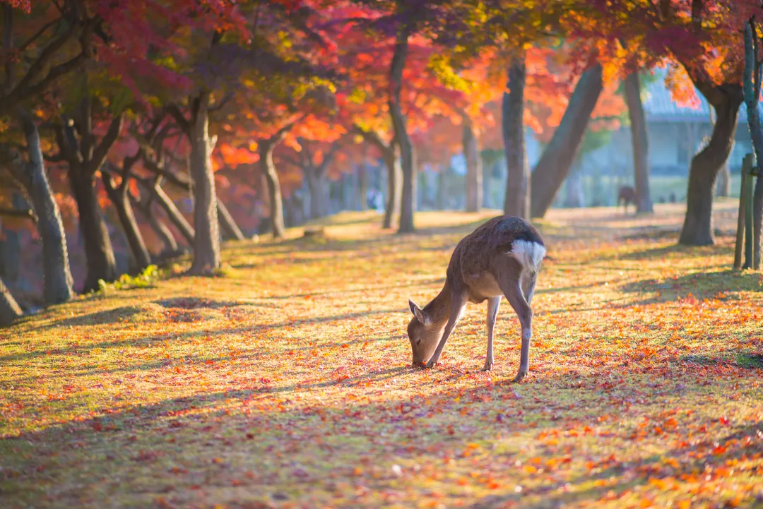 ◈【奈良公园】奈良公园位于奈良市区的东侧、春日山脚下。公园中一年四季景色优美如画,在开阔的草甸上生活着成百上千只野生梅花鹿,公园周围还聚集着东大寺、春日大社等名胜古迹。公园内景色宜人,春季嫩枝发芽、秋季满园枫叶,而在其他季节也很适合悠闲自在地漫步。在奈良很容易看到小鹿,而奈良公园则是鹿群较为集中的地方,因此也有人称它为“梅花鹿公园”。在公园里,随处可见成群的梅花鹿,与它们亲密接触是游客来此的一大乐趣。小鹿们或是默默在草地上觅食,或是相互嬉闹玩耍,或是走到你面前来弯下头蹭蹭你,非常讨人喜欢。这里有不少卖鹿饼的摊位,你可以买一点来喂鹿吃。机灵的小鹿一嗅到你手中的鹿饼便会跟过来。