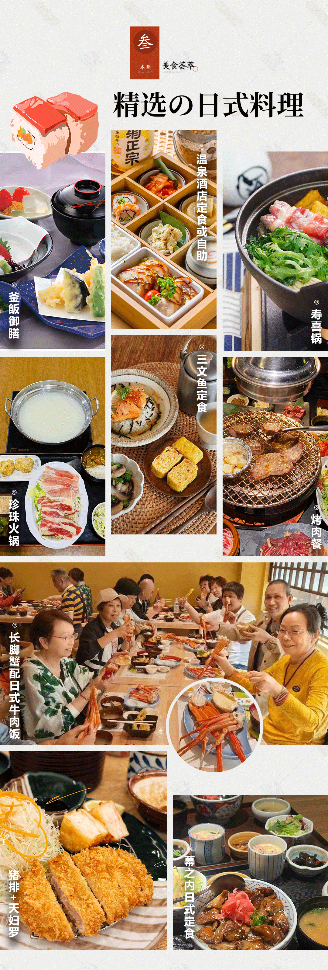 【用餐】全程6早10正(早餐为酒店含早,升级一顿为长脚蟹料理,其中一餐为温泉酒店自助餐或会席料理,以酒店提供为准),行程中团队用餐,客人自愿放弃,费用不退。正餐餐标1500日元。