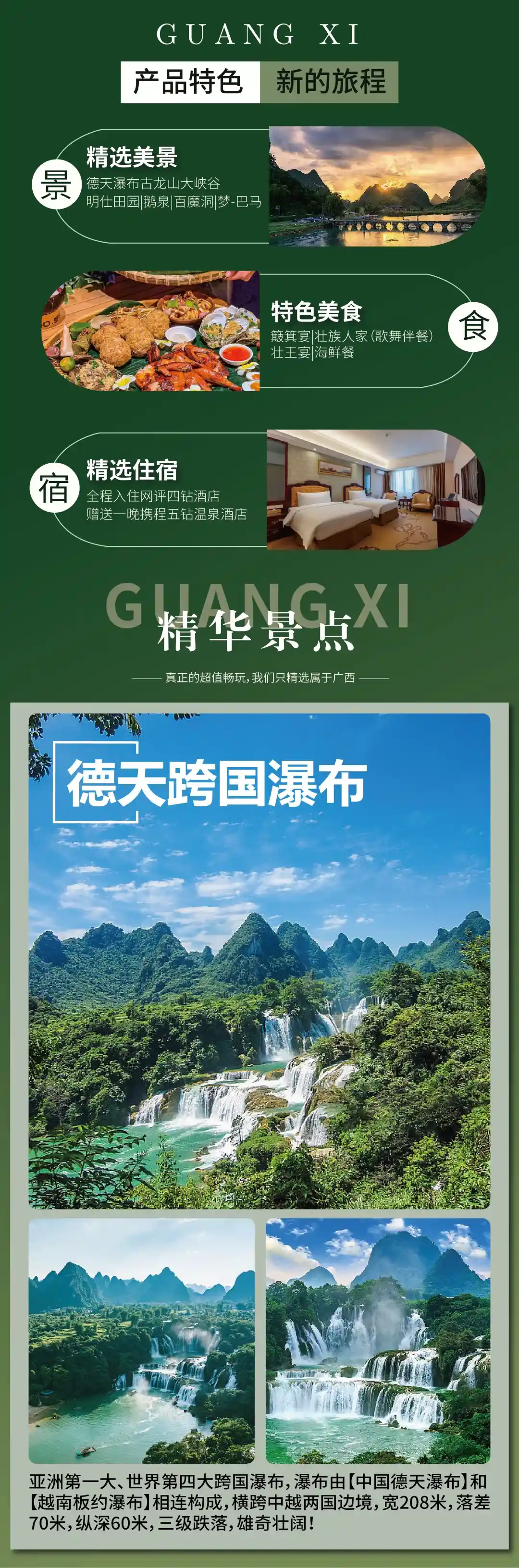 温馨提示:1.德天景区内电瓶车(单程10元/人)、竹排(48元/人)以及所有景区内的集市非旅游行程推荐的自费项目和购物项目,由此产生的费用自理;