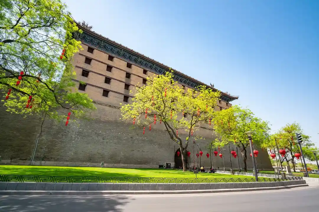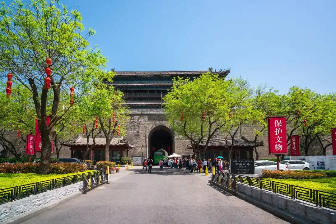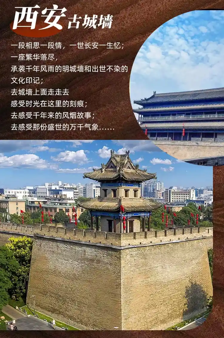 ●【西安城墙东门】,外观西安城墙建于明洪武年间,是以隋唐皇城墙为基础扩建而成,四个方向的主门均由“阙楼、箭楼、正楼、瓮城”组成,全长12公里,犹如一条巨龙环绕着古城西安,守护着西安人民走过悠悠的历史岁月。参观完成后漫步于最具西北少数民族特色的仿古一条街