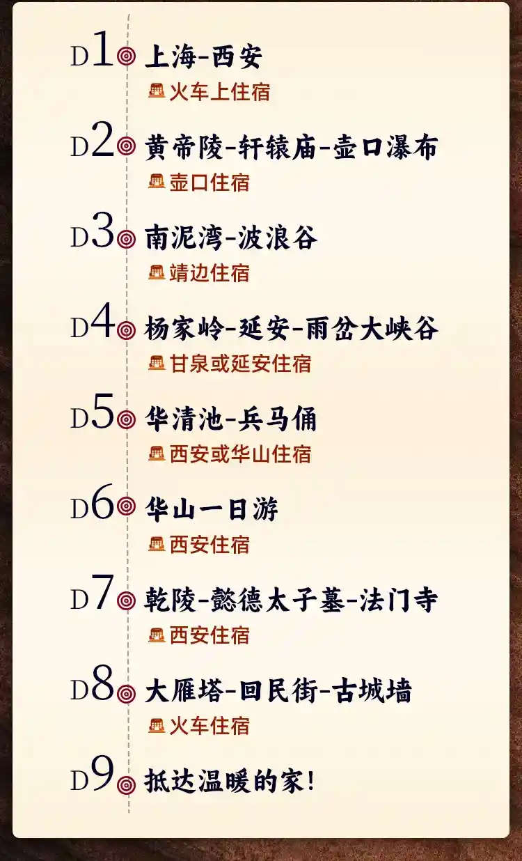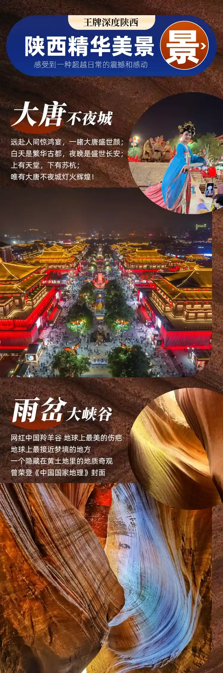 兵马俑/大唐不夜城/壶口瀑布/黄帝陵/轩辕庙/南泥湾/华清池/华山/乾陵/法门寺/大雁塔/回民街/古城墙/波浪谷/雨岔大峡谷/延安