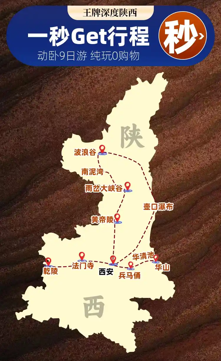 S1爆款❤王牌深度陕西+雨岔大峡谷+波浪谷+兵马俑/大唐不夜城等双卧9日游2680元/人起 纯玩0购物-