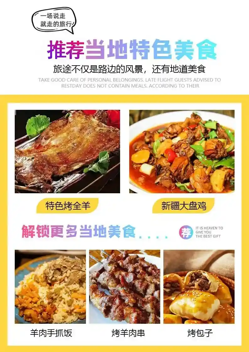 特色赠送:新疆馕饼每人一张,馕饼在新疆有2000多年的历史了;
