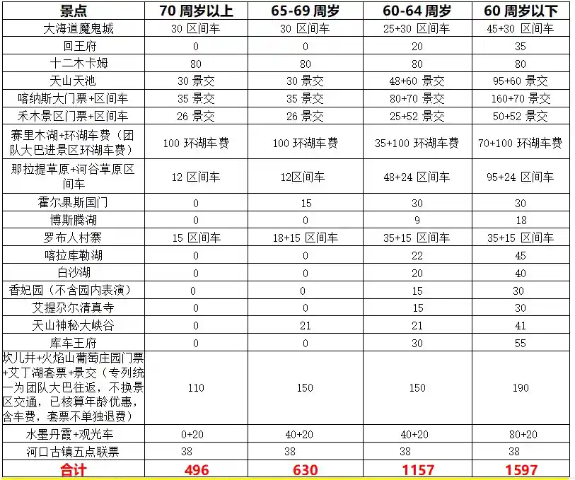 点门票费用在返程专列上由导游退还。下表各景点门票价格为参考价格,门票及老年优惠政策以景区当天实际价格