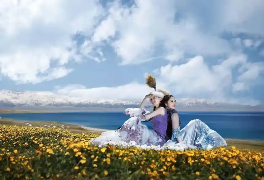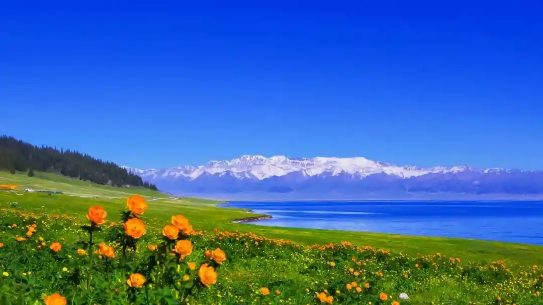赛里木湖畔花海无边,雪山壮丽,绿草如茵,风光如画,金黄的毛茛花似橙黄色的腰带围绕着湖畔偶尔点缀的紫苏花,也变得无比娇艳起来;