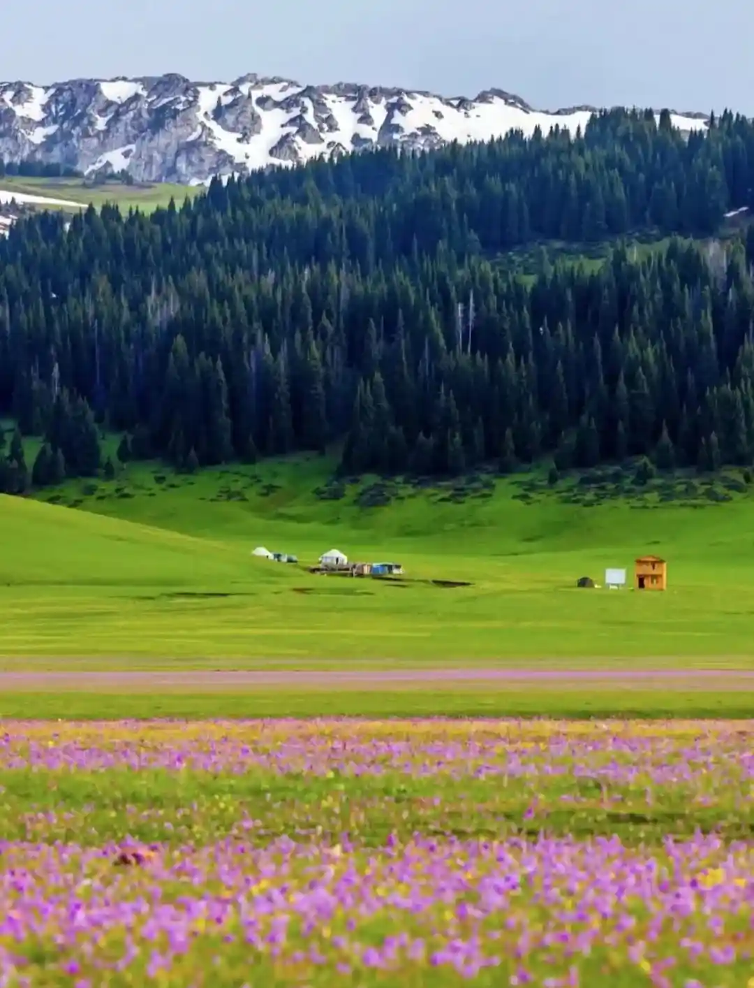 那拉提草原上的野花竞相开放,红的、蓝的、紫的、黄的花,与绿草、白色皑皑的雪山、蓝天白云,构成五彩的画面;