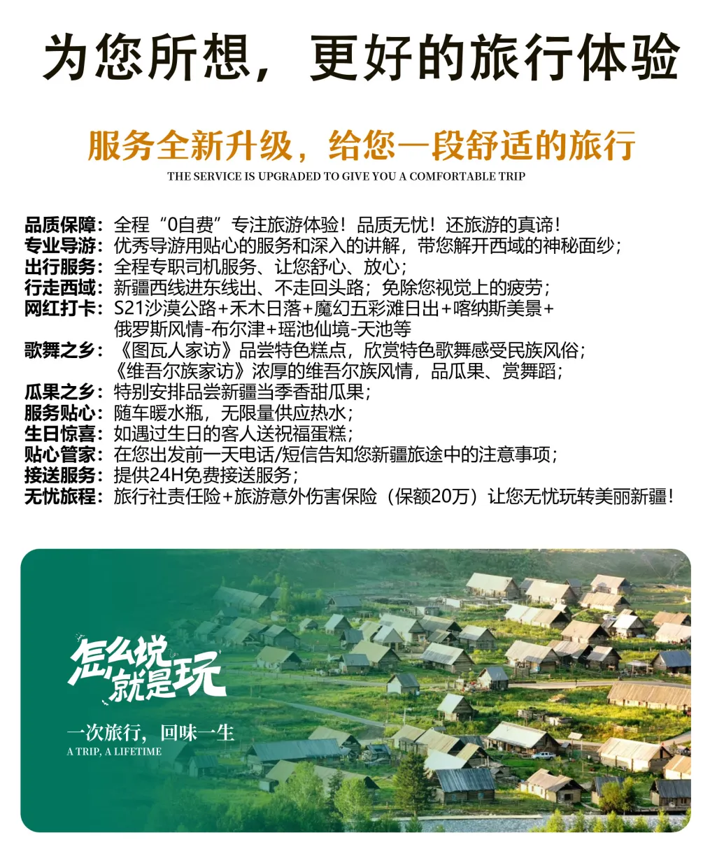 6、导服:D2→D7天全程中文导游讲解服务(持导游资格证上岗);因新疆旅游业处于起步发展阶段,当地导游服务无法与内地导游相比较,请游客谅解!如全团人数不足10人,司机负责行程中的衔接与办理相关门票事宜;行程中无导游服务,敬请谅解!接送机/站无导游安排!