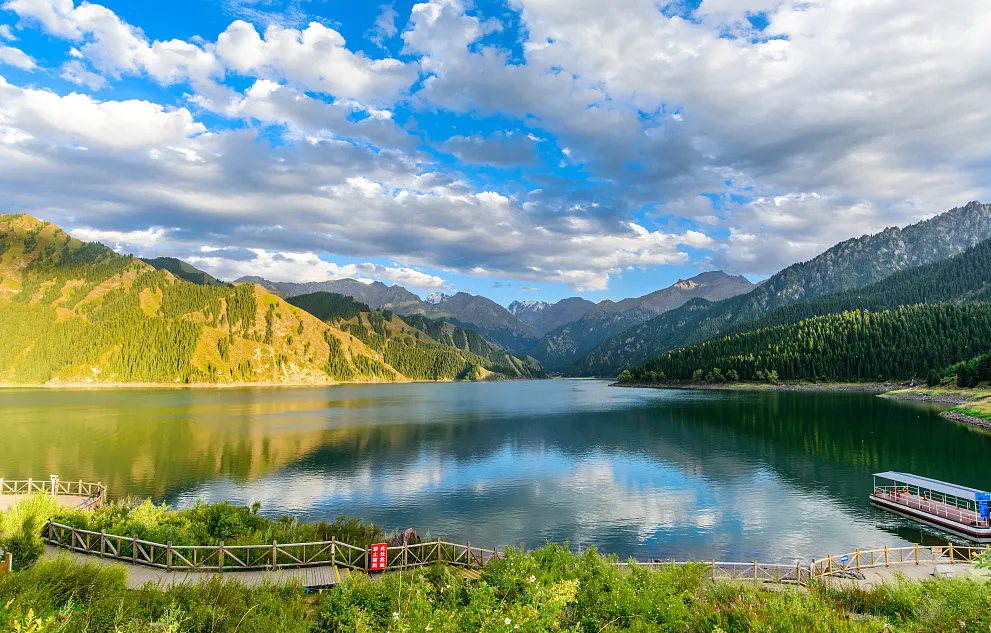 乘车前往【天山天池风景区】(游览约4小时),又称天池国家地质公园,天山天池,又称天池国家地质公园,古称“瑶池”,位于昌吉州阜康市境内,博格达峰的北侧,距乌鲁木齐市约110公里,是新疆有名的旅游胜地。是中国国家级风景名胜区、国家5A级风景区,在中国古代神话中,天池还是西王母娘娘沐浴的地方。天池湖面海拔1910米,深处达105米,湖面倒映着博格达峰,周围云杉环拥,风景犹如仙境。景区内囊括了高山湖泊、湿地草甸、森林峡谷等自然景观。2013年被列入联合国教科文组织世界遗产名录。