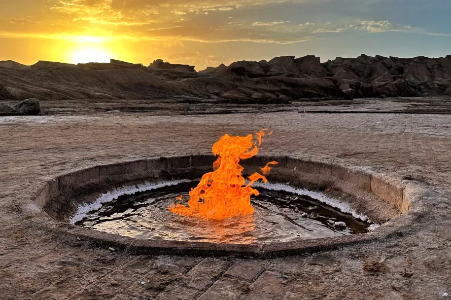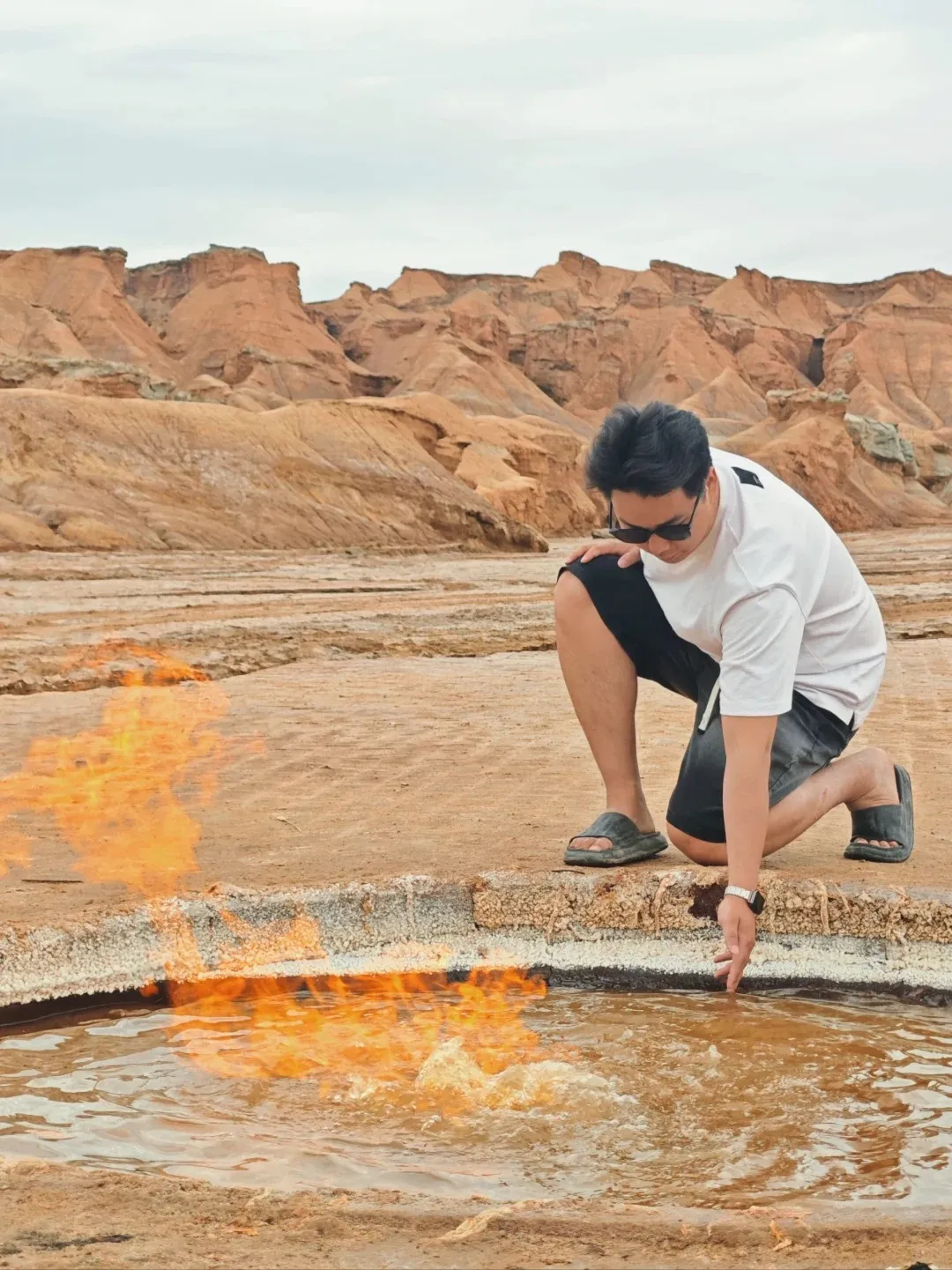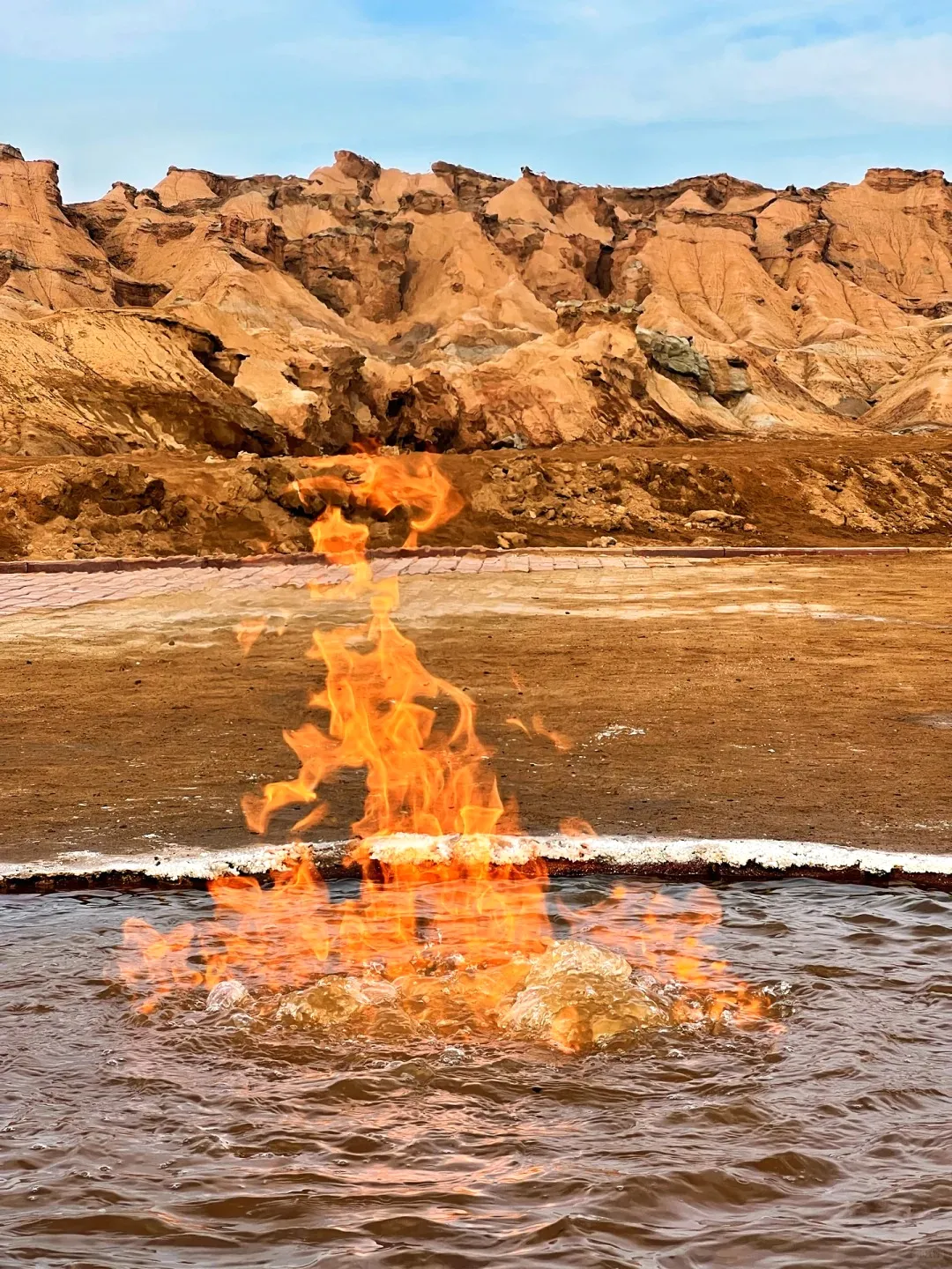 【烈焰泉】位于新疆阿克苏地区拜城县的克孜尔魔鬼城附近,是一处自然奇观。烈焰泉的形成源于地下高温地质活动和丰富的天然气资源。当地下高温地质活动产生的天然气通过裂隙和孔隙进入地表,与泉水交融,遇到火种时便喷出壮观的火焰。这种水火交融的现象使得烈焰泉成为了一个独特的自然景观。