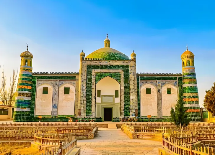 乘车前往喀什,游览【香妃园】这是一座典型的伊斯兰古建筑群,也是伊斯兰教圣裔的陵墓。教经堂的墙体以砖砌成,其外敷以草泥,表面为白色石膏层,穹窿顶用绿色的琉璃砖装饰,因而又称“绿拱北”。教经堂前有一处平顶式天棚,以15根高5米的木柱支撑,柱体上镌有精美的浅浮雕,虽历时弥久,其精湛的雕刻工艺令人喷叹不已。