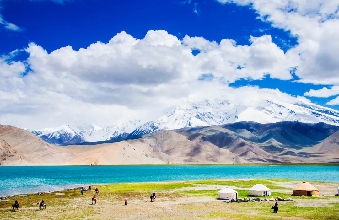 【卡拉库里湖】卡拉库里湖,位于冰山之父—慕士塔格峰的山脚下,距离喀什191公里,中巴公路从湖畔经过,这里离攀登慕士塔格峰的大本营不远(徙步走或骑骆驼,5小时到达)。“卡拉库里”意为“黑海”,海拔3600米,湖深30米,总面积10平方公里,是一座高山冰蚀冰碛湖。水面映衬着巍峨又神秘的慕士塔格峰,白雪皑皑,山水同色,景色十分迷人。风景名胜卡拉库里湖是世界上少有的高原湖泊。湖的四周有冰峰雪岭环抱,特别是周围的公格尔、公格尔九别峰和慕士塔格峰更为这个湖增添了神奇而美丽的色彩。在风平浪静的日子里,皑皑银峰、绿色草原和湖边畜群倒映在湖中,异常优美。