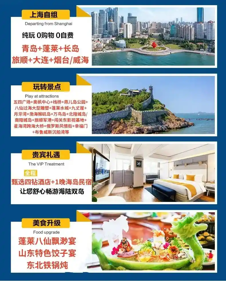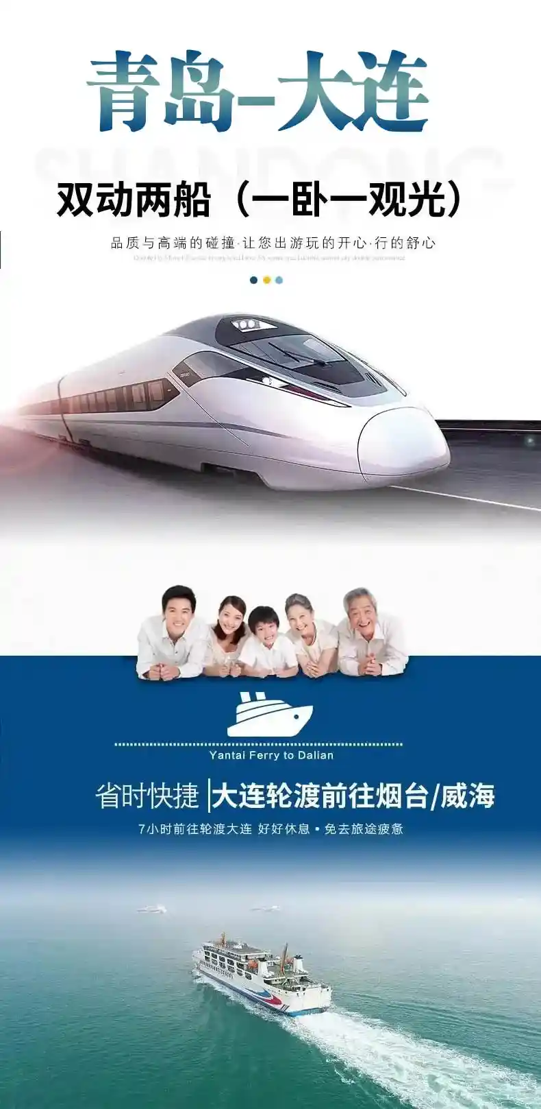 1、大交通:上海-青岛-上海动车;旅顺-长岛“寻仙号”巡游船票 (随机安排)