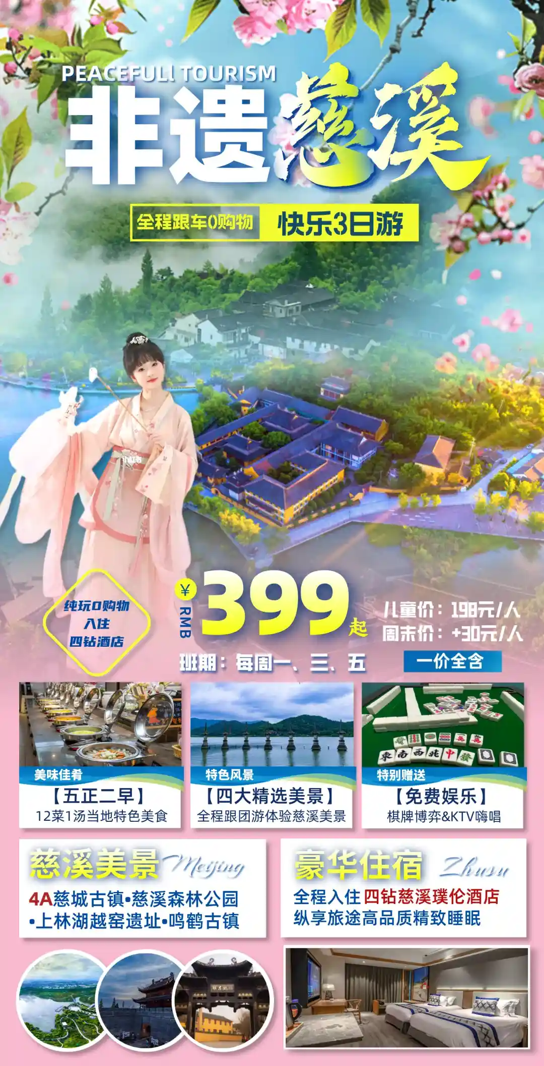 第一天:上海出发到酒店→在酒店享用午餐→下午游玩慈城古镇(4A)→在酒店享用晚餐后→自由安排酒店娱乐麻将KTV