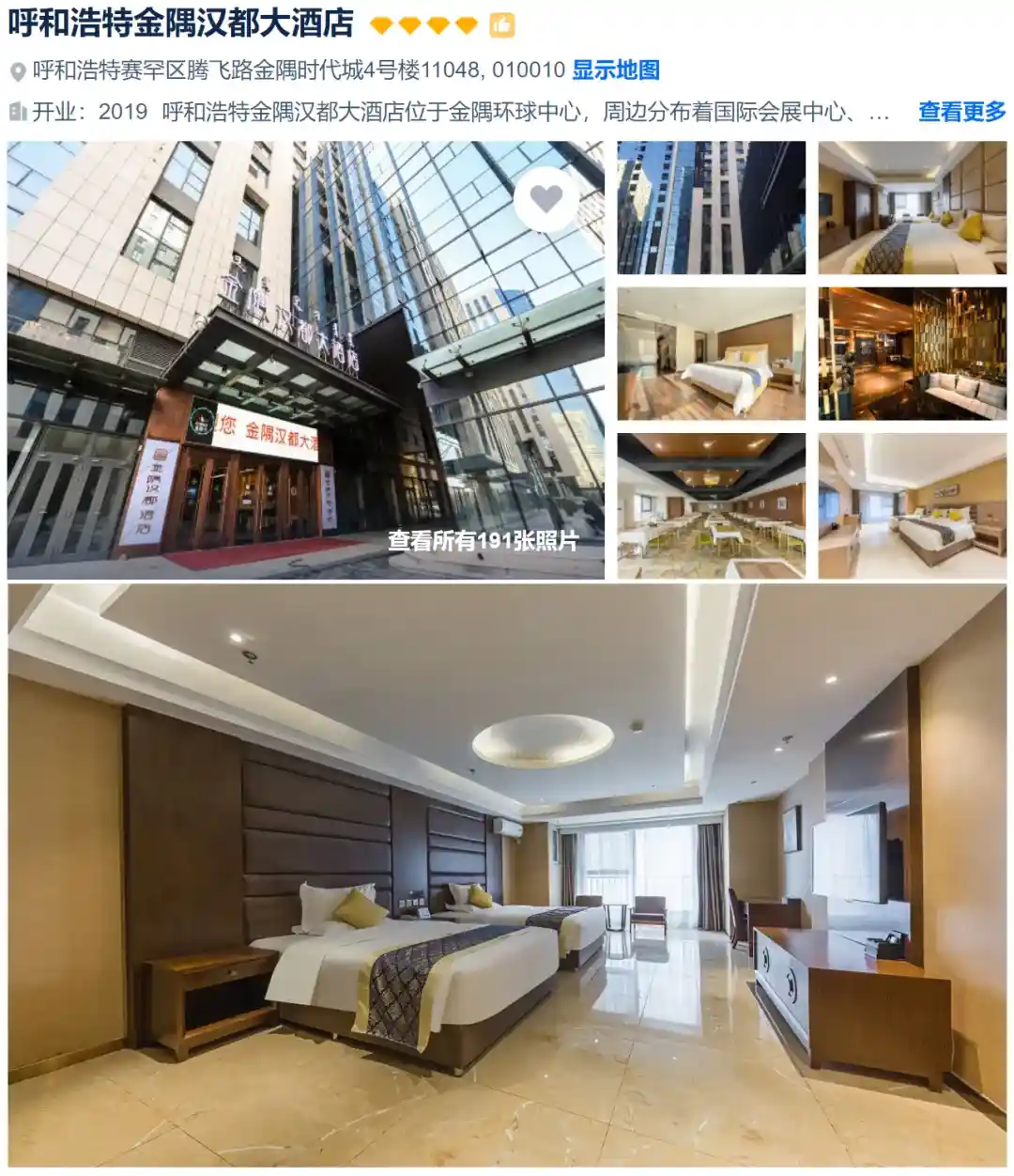 呼和浩特*2晚:(郎怡大酒店、海亮大酒店、金隅汉都、华滨大酒店、春雪四季。祥泰大酒店)或同级
