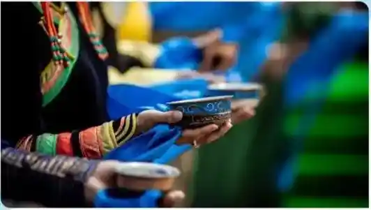 ●【银碗哈达敬酒】是蒙古族迎送、馈赠、交际、奖赏,定亲时使用的重要礼品之一,表示敬意和祝贺;敬酒是蒙古族群众招待宾客礼节的主要一环。酒具一般为银碗或银盅。敬酒时,男主人必须头戴帽子,衣着整齐,斟好酒后,双手托起哈达捧银碗、唱敬酒歌,以辈数或年龄大小依次敬酒。