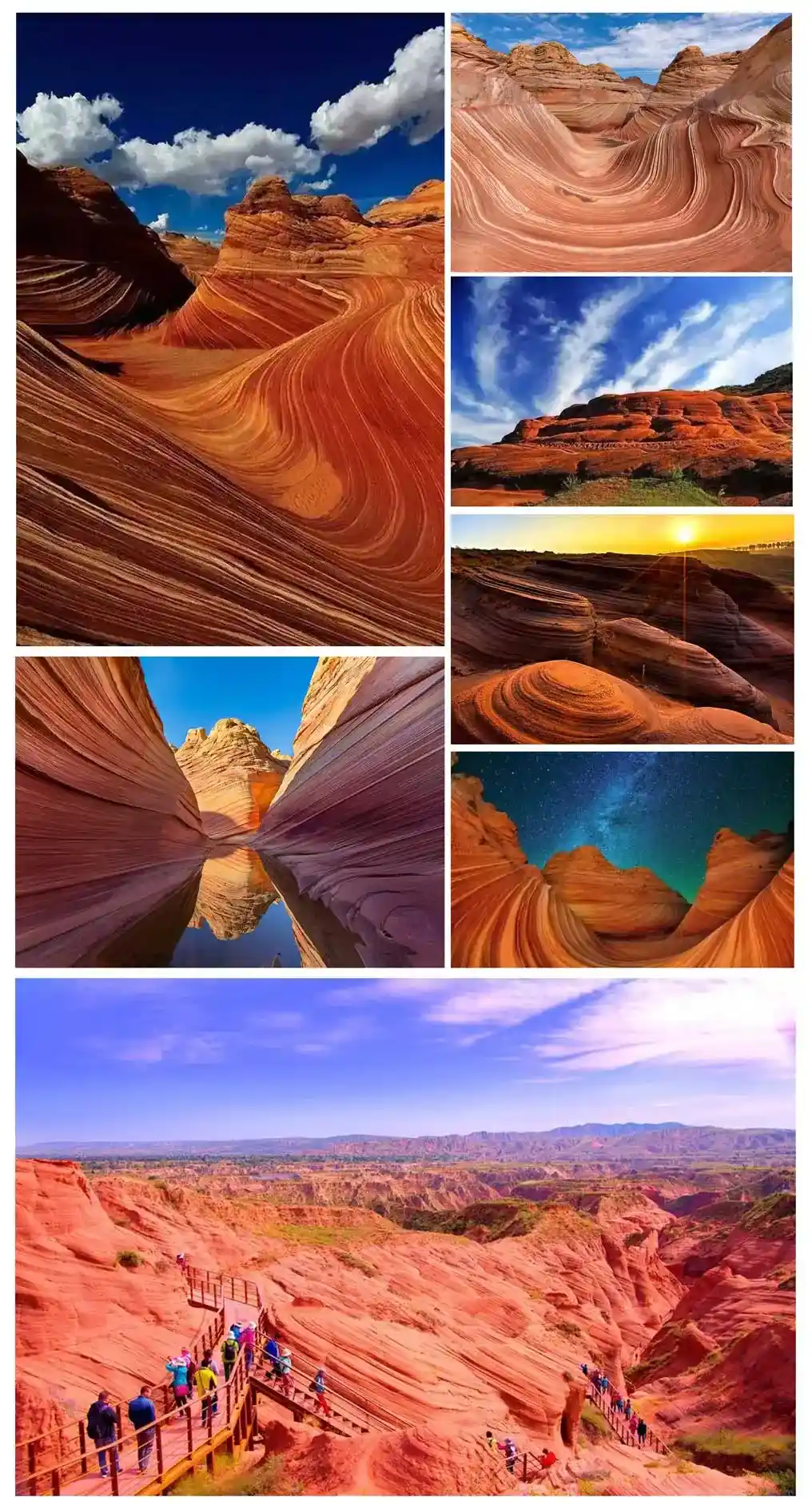 ●【波浪谷】展示的是由数百万年的风、水和时间雕琢砂岩而成的奇妙世界。波浪谷岩石的复杂层面,是由一亿五千万前侏罗纪就开始沉积的巨大沙丘组成。沙丘不断地被一层层浸渍了地下水的红沙所覆盖,天长日久,水中的矿物质把沙凝结成了砂岩,形成了层叠状的结构。后前往位于山西省永和县打石腰乡河会里村和陕西省延川县城南部53公里接壤处