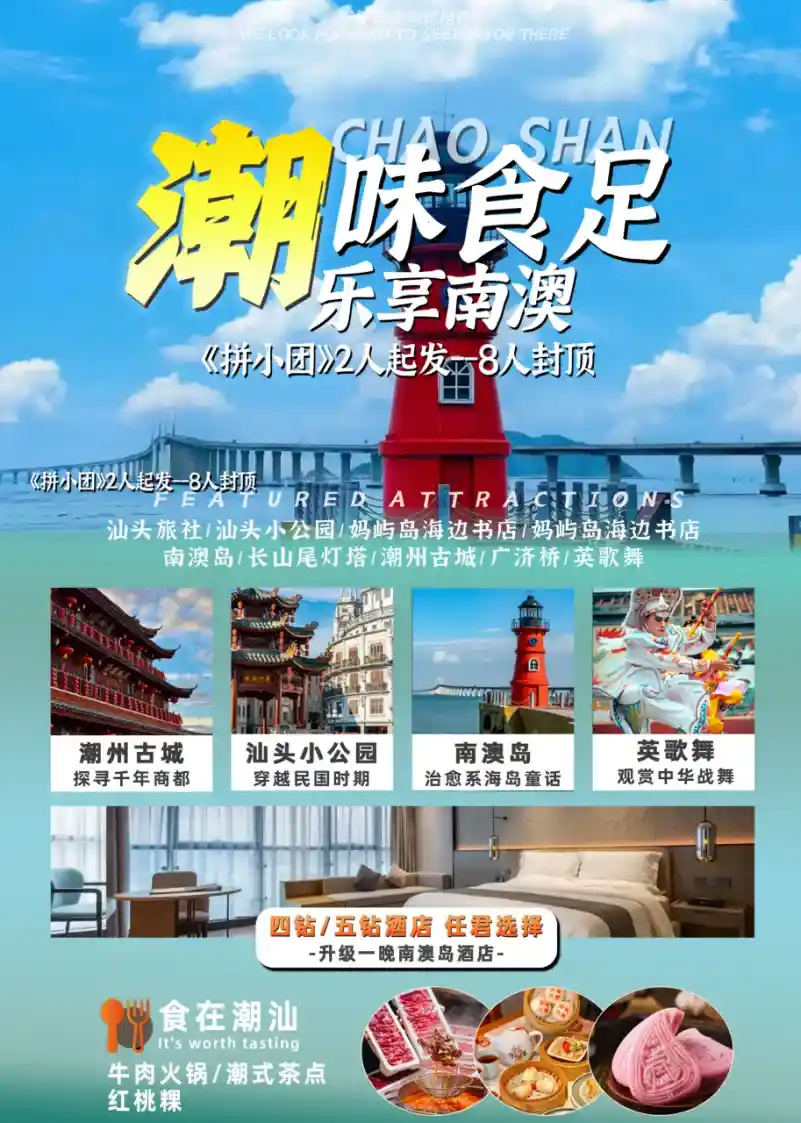 潮味童趣·乐享南澳●8人小团❤汕头旅社+小公园+妈屿岛海边书店+南澳岛+长山尾灯塔+潮州古城+广济桥+英歌舞5日游