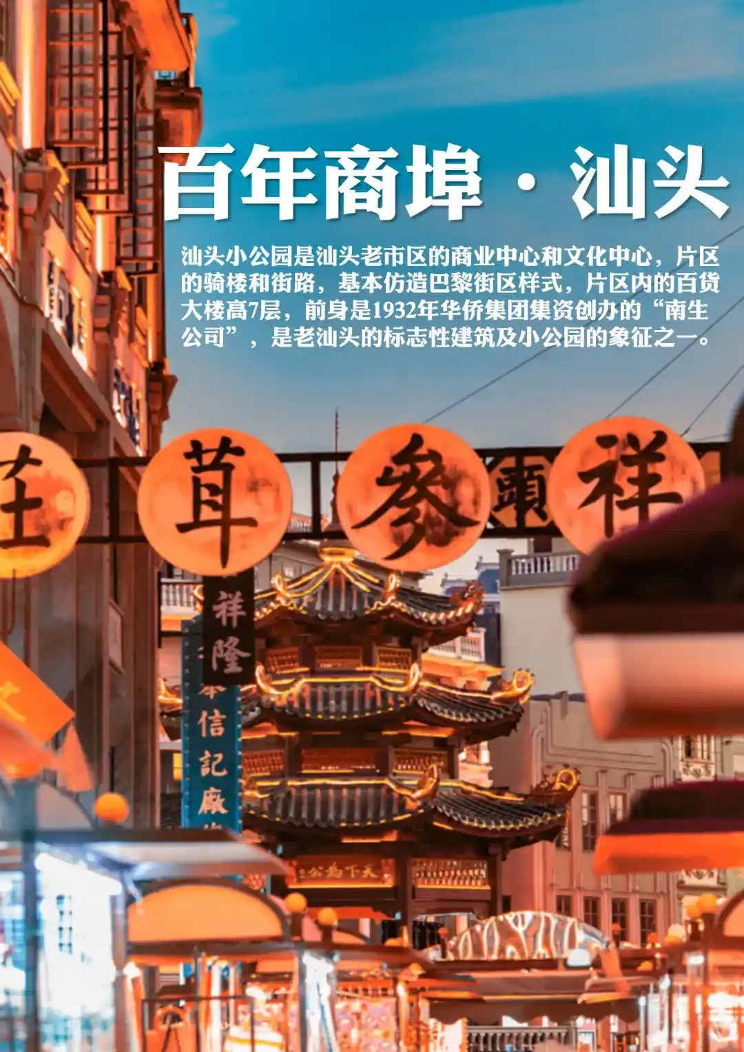 ●【南生百货】百货大楼是汕头老城区一座非常具有特色的建筑,大楼外观古色古香,在这比较适合拍复古片。【汕头小公园】(可自由品尝当地美食)汕头小公园,汕头老市区的商业中心和文化中心,是汕头老城的核心地标和文化标志。狭义的小公园,指位于小公园片区核心的中山纪念亭。广义的小公园,涵盖中山纪念亭周边的街区,包括安平路、升平路、国平路等等,统称小公园历史文化区。