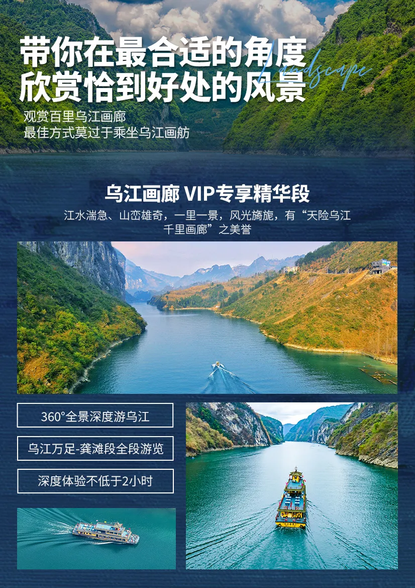 早餐后,乘车至彭水乌江画廊万足码头,乘游船观【乌江画廊】(游船费用自理),千里乌江、百里画廊美丽风光,乌江发源于贵州省威宁县,自贵州省沿河县进入重庆酉阳自治县万木乡、龚滩镇、彭水自治县,至重庆涪陵汇入长江,全长1073公里,其中乌江彭水自治县、酉阳龚滩至贵州沿河段约100公里,拥有“千里乌江,百里画廊”的美誉。乌江百里画廊“山似斧劈、水如碧玉、虬枝盘旋、水鸟嬉翔”,“奇山、怪石、碧水、险滩、古镇、廊桥、纤道、悬葬”构成了乌江画廊的景观要素。