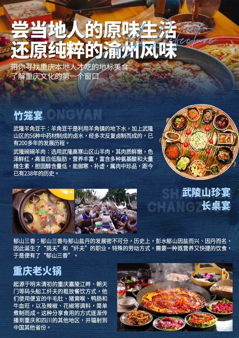 4大民俗风味美食 · 品尽山城麻辣鲜香:竹笼宴+长桌宴+武陵三珍宴+特色火锅