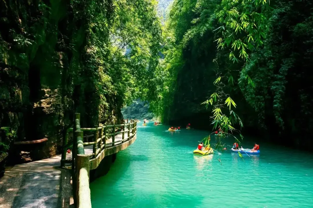 然后乘车至阿依河,游览【阿依河】景区(游览时间不低于120分钟,不含竹筏放歌80元/人和青龙电梯(往返)50元/人,自愿消费),阿依河原名长溪河,发源于贵州省务川县分水乡,向东北蜿蜒而入重庆市彭水县境,经长旗坝、舟子沱、三江口,由万足乡长溪滩处注入乌江,全长13公里。从舟子沱乘舟而下,沿途可见各种各样的峡谷地貌:有状若擎天的石笋、嬉戏的猴群、庄严的石佛、深不可测的溶洞、貌似罗汉的石笋。整个阿依河彭水段水体资源极为丰富,其中以七里塘河段和儿塘河河段的水体景观独特,江面绿水清幽,两岸翠竹环绕。