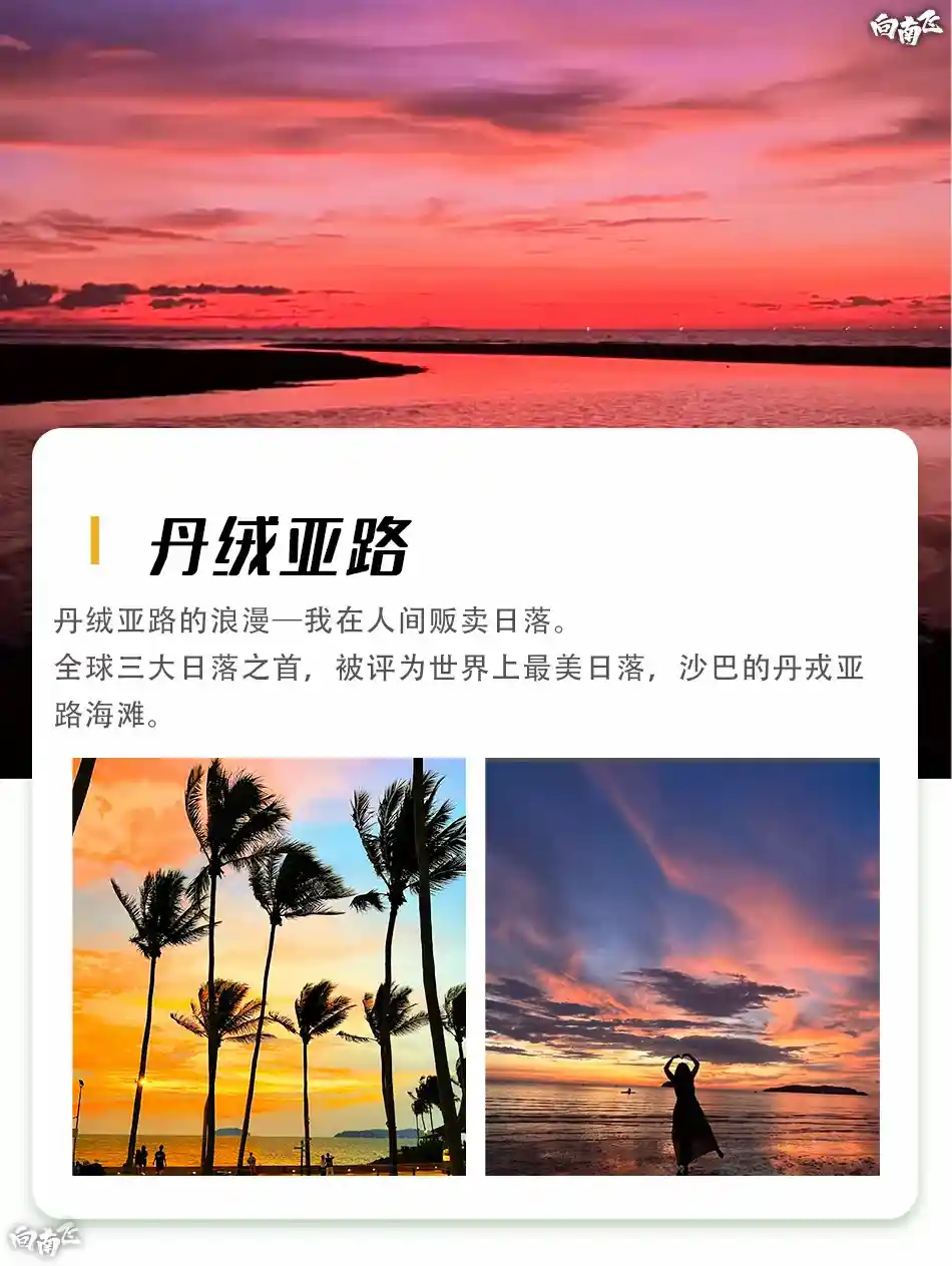 15:00-19:00 返回亚庇,前往香格里拉丹绒沙滩,欣赏最美日落。沙巴的丹绒亚路海滩与意大利的普利亚海滩以及古巴的加勒比海滩并称为全球三大醉美日落海滩,日落景象根据天气状况而变换,气象万千,美不胜收。