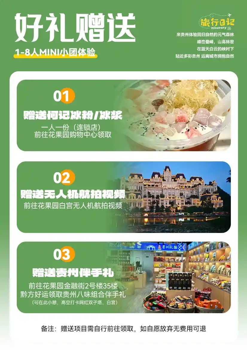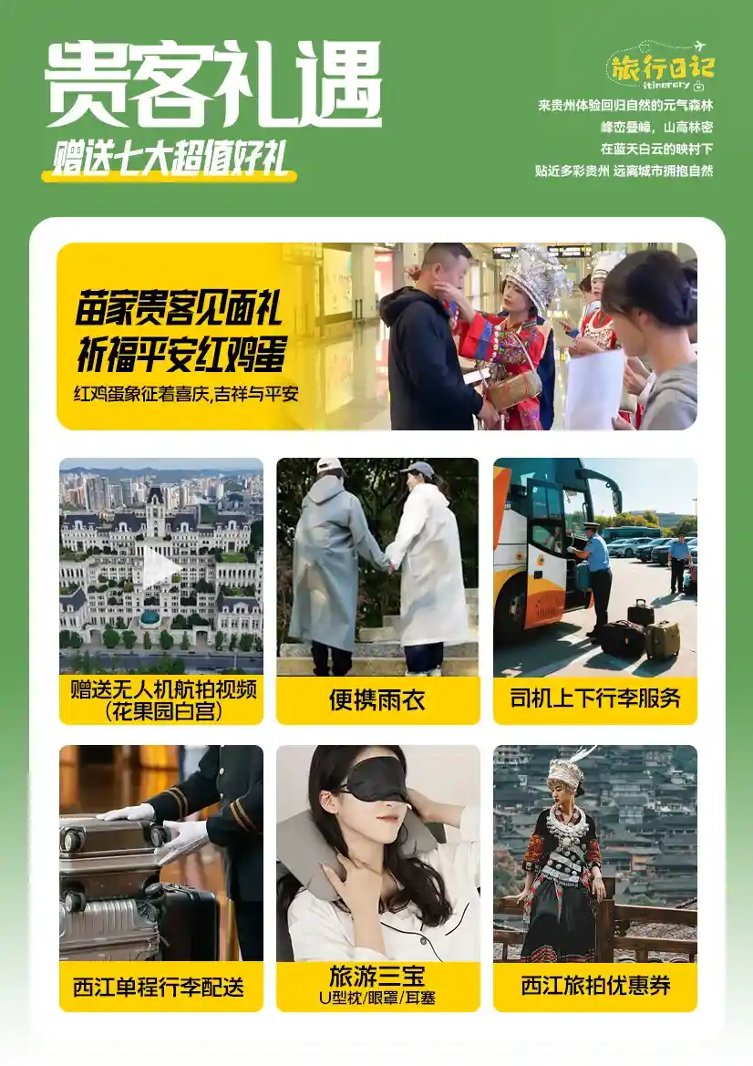 2.西江赠送行李单程配送服务(限每人一件10公斤内),超出产生费用自理,具体以景区收费为准