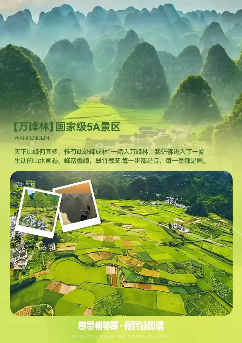 早餐后,乘车前往游览国家级AAAAA景区,“中国最美的五大峰林”【万峰林】,(不含电瓶车50元/人,不含小火车50元/人,必须消费敬请自理)整个万峰林风景,平卧在农田中央的八卦田神奇迷离。于峰峦间俯瞰福字田,心中的稻田上仿佛也刻下了一个福的印记。如诗如画的织锦田园和浓厚的少数民族文化,共同交织出万峰林旖旎多姿的精彩画卷。