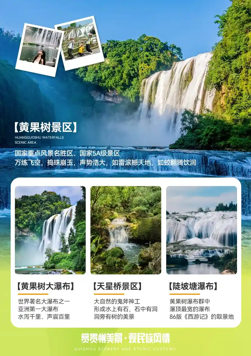 5.门票:含黄果树景区大门票,小七孔景区大门票,西江千户苗寨大门票,梵净山大门票,万峰林大门票,马岭河大门票。