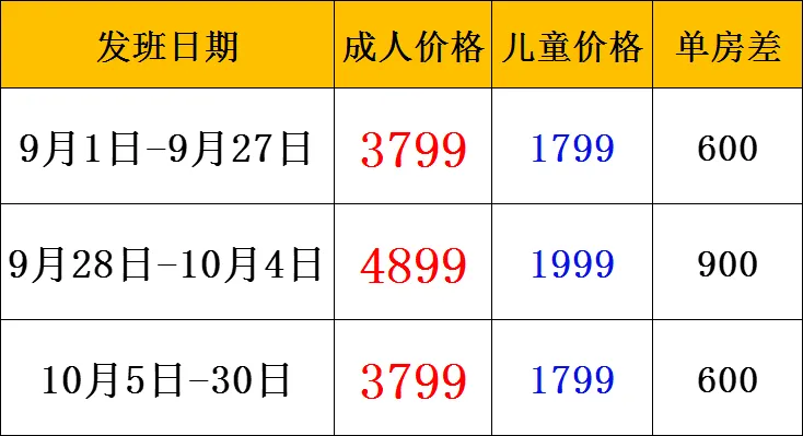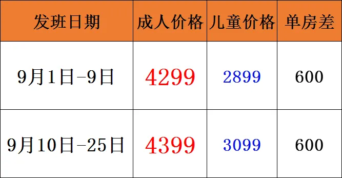 3. 单房差:不含自然单房差,如需单人入住一间房或携带异性儿童时,则需要补交单房差。