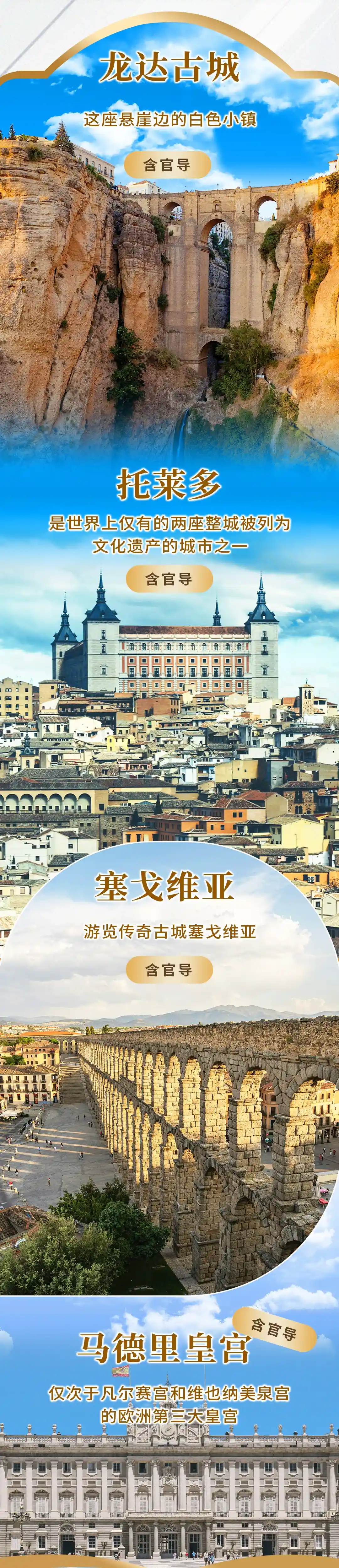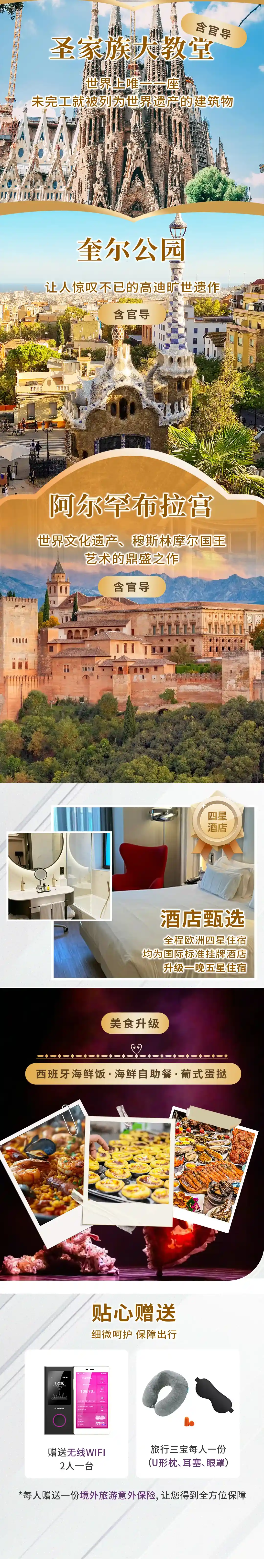 【门票】 行程中所列景点标*符号(龙达官导,托莱多官导,塞戈维亚官导,马德里皇宫含官导,圣家族大教堂含官导,奎尔公园含官导,阿尔罕布拉宫仅含花园官导;)入内参观,其余均为外观;