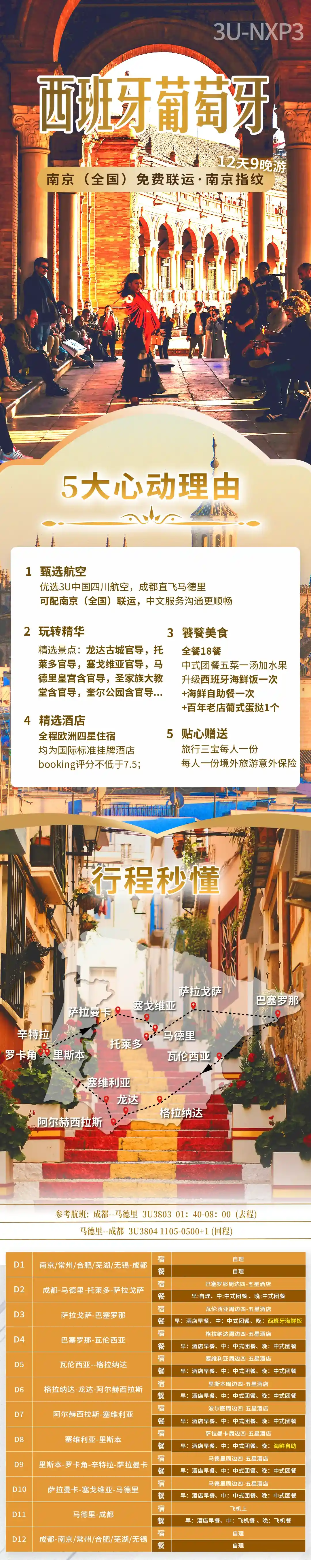 3U-XP3-四川航空-南京起止-南京指纹-西班牙葡萄牙12天9晚(3U-XP3+全餐)(10-12月)