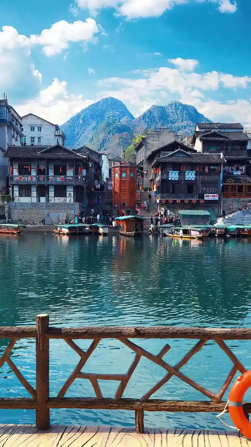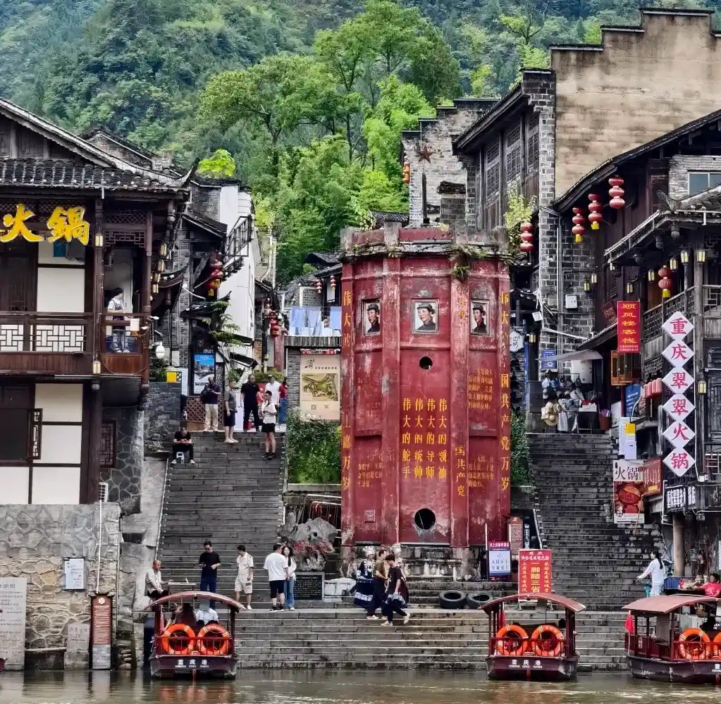 后前往沈从文小说《边城》的原型地,素有一脚踏三省的【边城茶峒】,西与贵州省松桃县的迓驾镇和重庆市秀山县的洪安镇接壤,北与重庆市秀山县的峨蓉乡隔河相望。沈从文先生把茶峒古镇优美的风景、淳朴善良的风俗人情等融为一体,勾画出了田园牧歌般的边城风貌。清澈的酉水穿城而过,碧绿如翡翠。河面上,古老的拉拉渡悠悠往返。不用船桨,全靠一根横跨两岸的钢索和船夫手中的木柄,这独特的渡河方式,是茶峒独有的浪漫。站在渡船上,微风拂面,能感受到岁月的轻柔抚摸,似乎时间都慢了下来。坐着古老的拉拉渡,中午就到了重庆来吃火锅。
