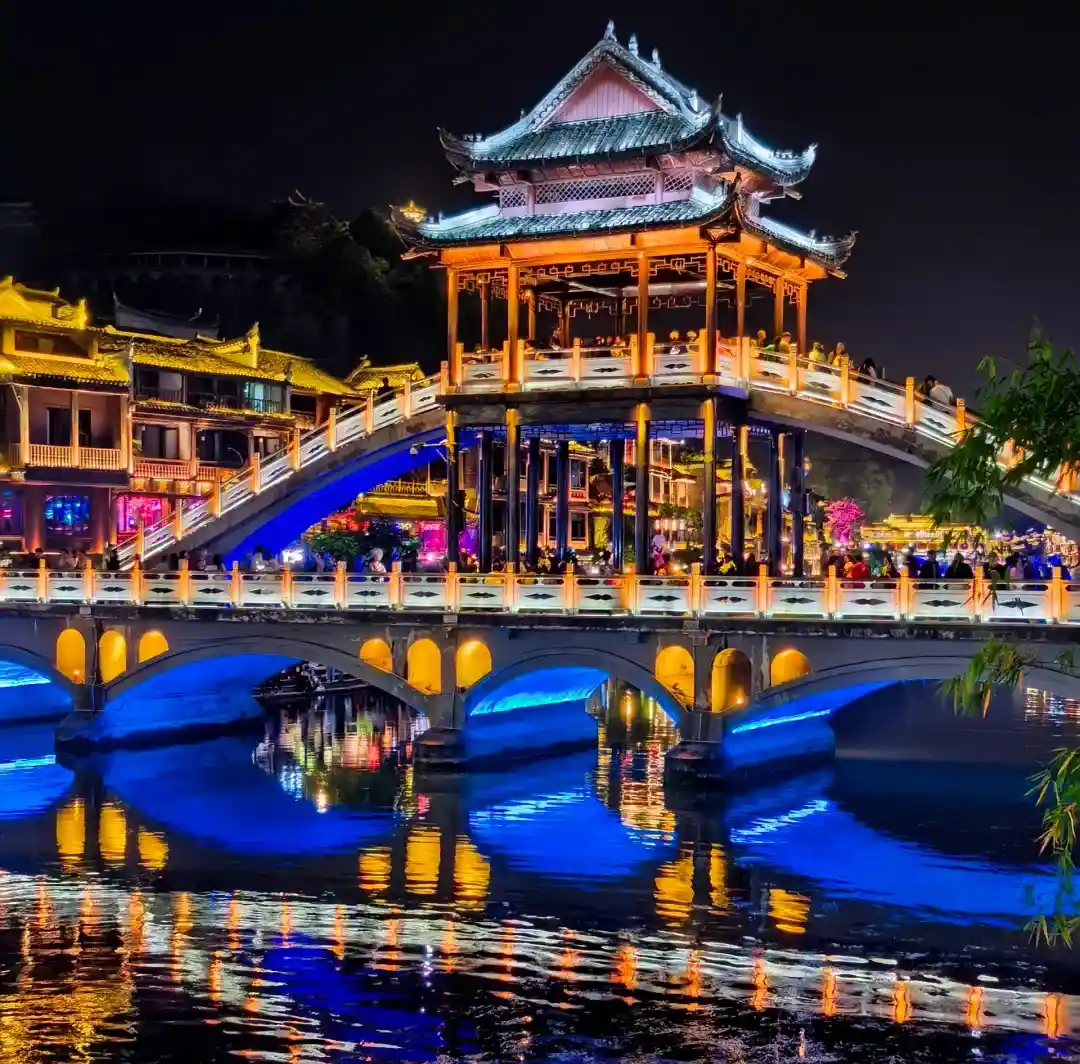 【沱江泛舟】乘坐乌篷船顺流而下,听着艄公的号子,游览凤凰古城的母亲河,看着两岸已有百年历史的苗家吊脚楼,别有一番韵味。晚上欣赏【凤凰古城夜景】沱江两岸醉人夜色—带您穿越千年凤凰的必游景点!观看【七重灯光秀】,欣赏中国首个以苗族文化为故事线的夜游大作。(赠送项目不看不退,也不做等价交换请谅解)。在霓虹灯下感受古城的温馨与浪漫,一场美丽的邂逅正等着您......。