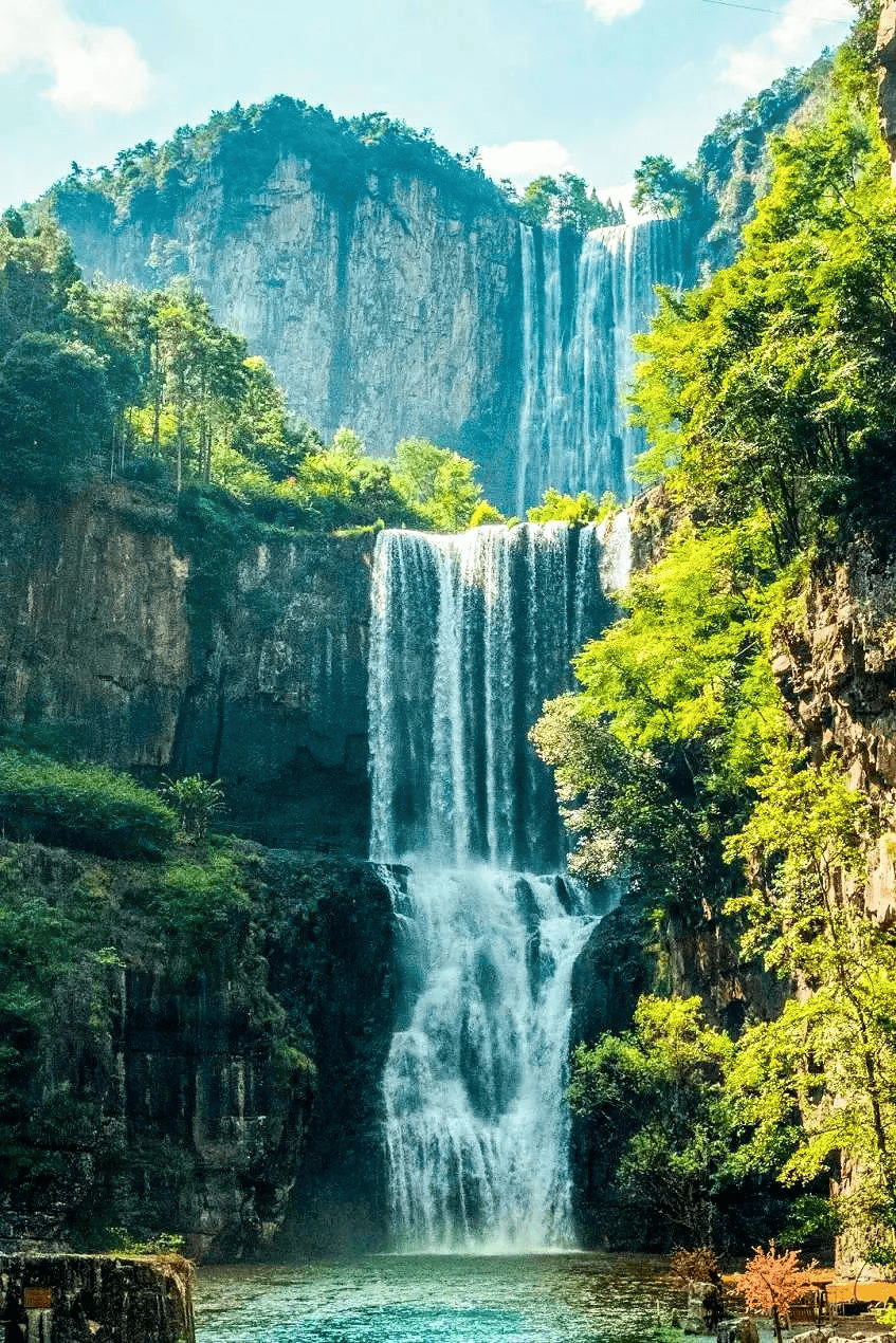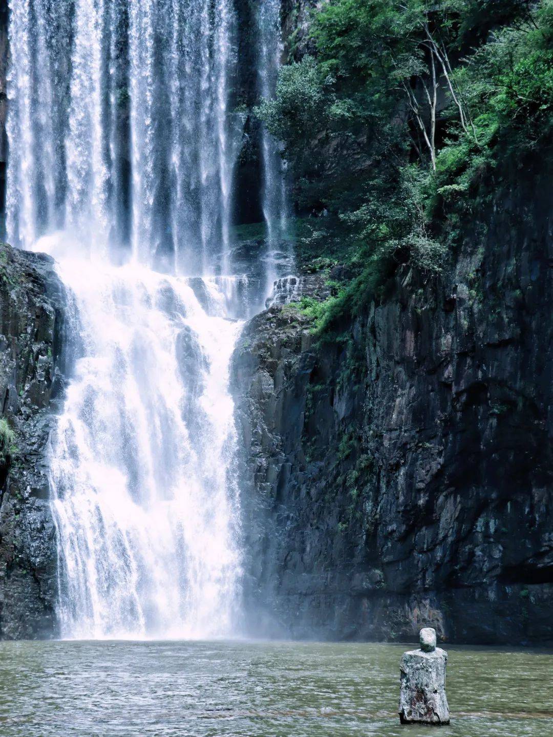 二漈前临水而建的观景平台是欣赏瀑布的绝佳位置,可以同时看到一漈和二漈相连,绵延下泻。二漈还拥有一个巨大的水帘洞:山体在此处神奇地向内做了一个近乎90°的弯折,形成一道躲藏于瀑布之后的岩廊。
