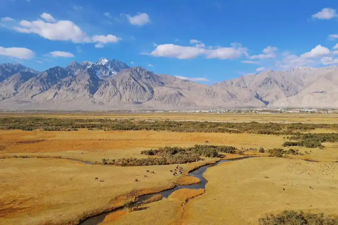 ◈早餐后,乘车前往【阿拉尔金草滩】(游览约1.5小时左右),石头城下,是帕米尔高原上的一片湿地。塔什库尔干河流经这里,公园内水草丰美,牛羊遍地,和远处的雪山白云蓝天交融在一起,风光优美。每当夕阳西下,碧绿的草地染成一片金黄色,非常美丽,因此也有“阿拉尔金草滩”之称。