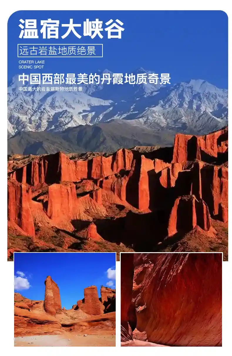 ◈早餐后,乘车前往【温宿大峡谷】(游览约4小时左右)温宿大峡谷有中国罕见的远古岩盐地质绝景、中国西部奇特的雅丹地质怪景、中国独有的巨型岩溶蚀地质秘境,堪称新疆"活的地质演变史博物馆"。游览结束后,乘车前往阿图什,抵达后,入住酒店休息。