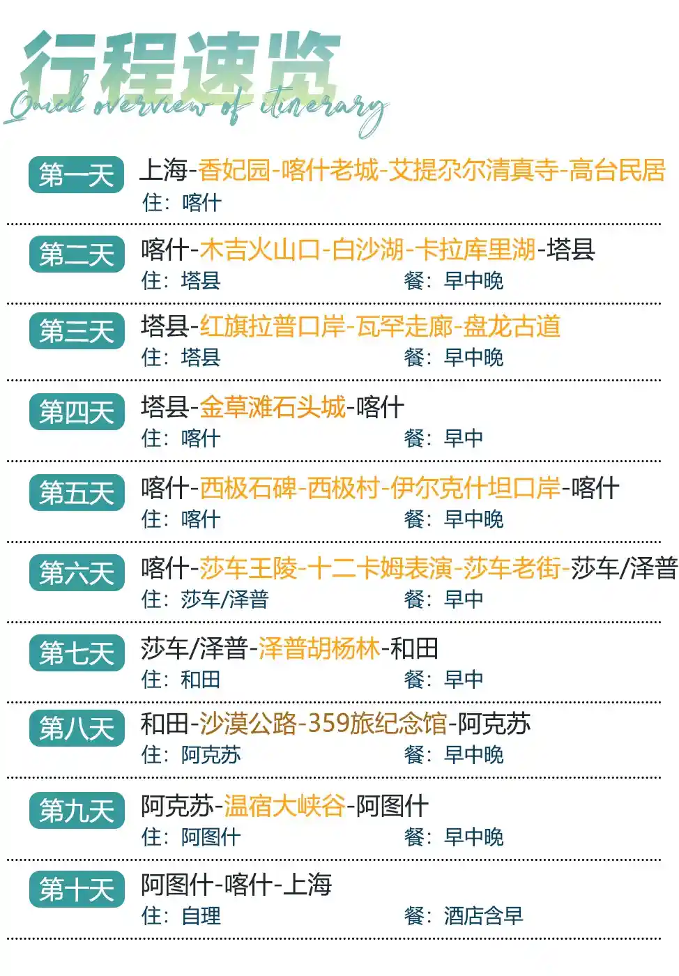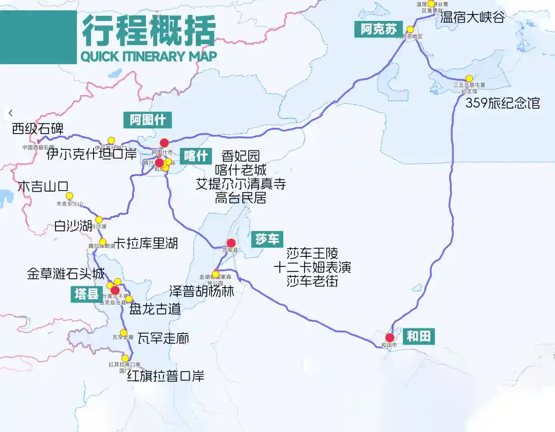 帕米尔高原|香妃园|喀什老城|艾提尕尔清真寺|高台民居|木吉火山口|白沙湖|卡拉库里湖|慕士塔格峰|红旗拉普口岸|瓦罕走廊|盘龙古道|塔合曼湿地|班迪尔湖|金草滩|石头城|西极石碑|西极村|伊尔克什坦口岸|莎车王陵|十二木卡姆|莎车老街|泽普金胡杨林|和田团城|和田夜市|塔克拉玛干沙漠|沙漠公路|359旅纪念馆|温宿大峡谷