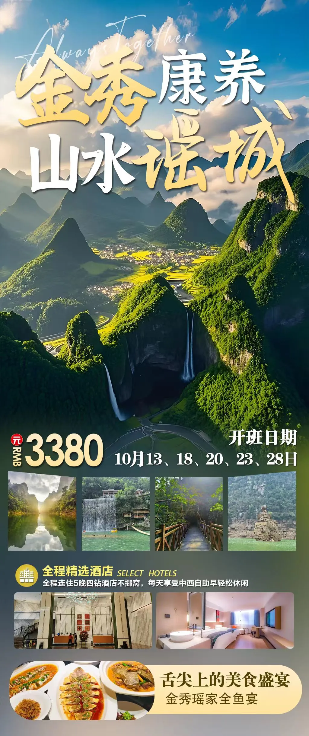 【金秀康养♡山水瑶城】连住五晚四钻酒店❤长寿之乡-金秀❤大瑶山盘王界(无障碍登山游览)❤圣堂湖❤木达木弄❤银杉公园❤博物馆❤瑶寨纯玩双卧8日游