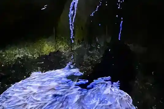 蓝棉瀑布:光线与硫磺的魔法,幻化出一匹抖动的蓝绸。正午时分,邂逅一道神迹般的钴蓝瀑布