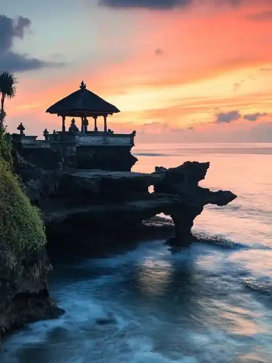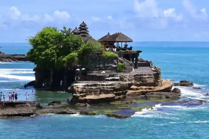 14:00-15:00--游览【海神庙-Tanah Lot】(游览约1小时),意指海中的陆地是印尼巴厘岛中西部海岸的一座寺庙,盖在一个经海水冲刷而形成的离岸大岩石上也是峇里岛六大寺庙之一。此庙灵气汇集,为难得圣地,当地居民建议之下在此立了此庙。海神庙名称的由来,据民间传说,底座的海蚀洞里,曾经出现过几条黑白分明似雨伞节的海蛇,当地人认为这是海神的化身,来保护庙宇及人民,自此,海神庙里终日香火缭绕,虔诚的村民络绎于此。