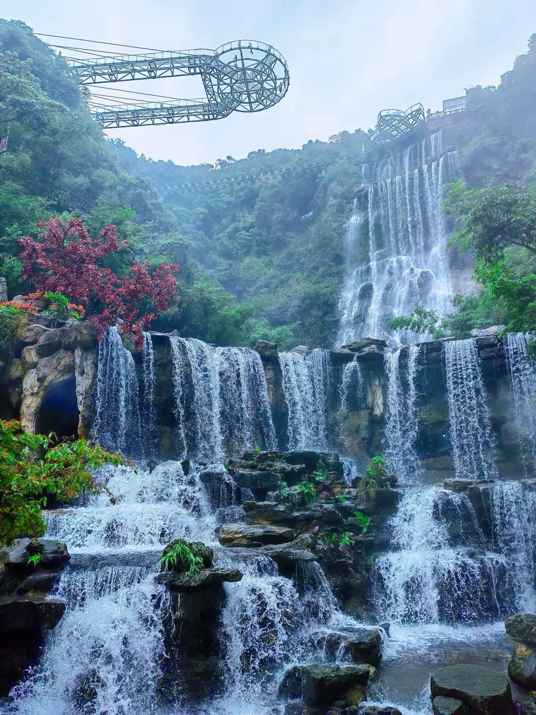 ●【九重飞瀑】高208米,是笔架山脉稀有的高空奇瀑,巨大的水幕如银河飘雪从山峰中飞泻层叠而下,气势磅礴,极其壮观。“香炉瀑布遥相望,回崖沓嶂凌苍苍,”瀑布两侧峻崖环绕,峰峦重叠,犹如世外桃源一般屹立于此。