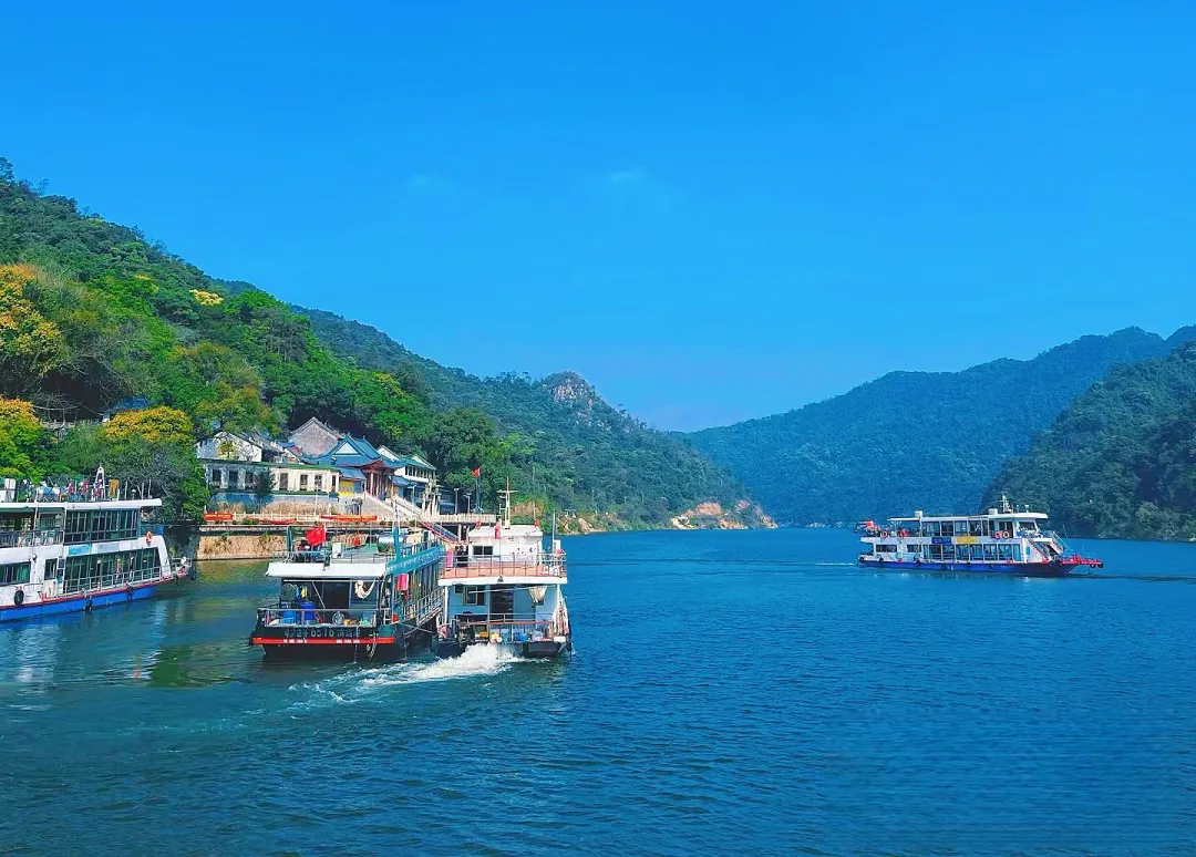 ●体验【小北江游船】清远小北江这里有“北江小三峡”的美称,所以来此最值一玩的就是坐船游北江,北江三峡全程共有36峰蜿蜒对峙,峡内奇峰壁立,气势雄浑,千姿百态,山水相辉;北江穿峡而出,江水清澈,河鱼肥美。沿着小北江溯流而上,虽然无长江三峡"两岸青山相对出"的险要,却胜在山清水碧,满眼都是翠绿惬意。风平浪静、山峦青翠欲滴、江湾碧绿清澈,一派诗情画意。沿途欣赏龙女、凤凰、漂渺、独秀等七十二峰,郁郁葱葱,峻美险奇,构成“一水远赴海,两山高入云”的大自然美景。