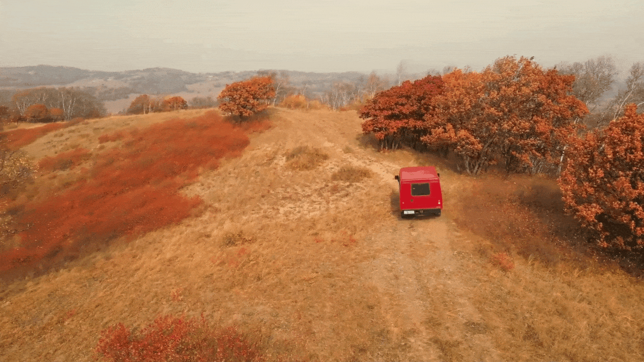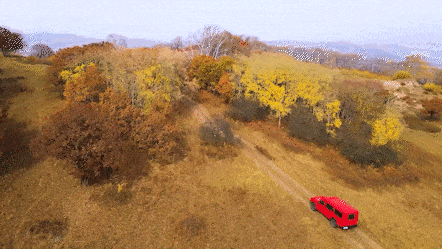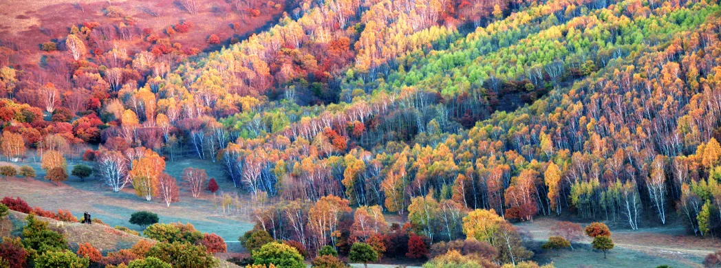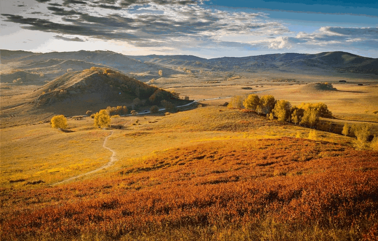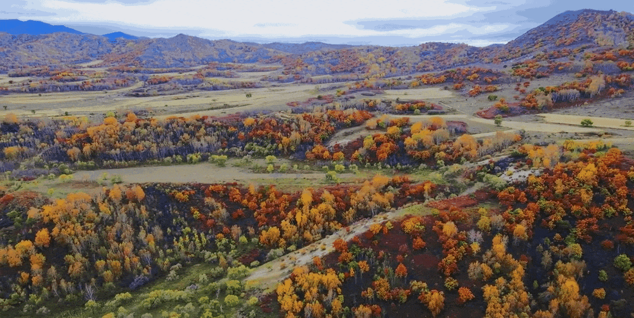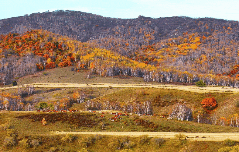 途径村庄,牧场、农田、疏林、草原,山峦起伏树种多样,深入秋季五彩斑斓。