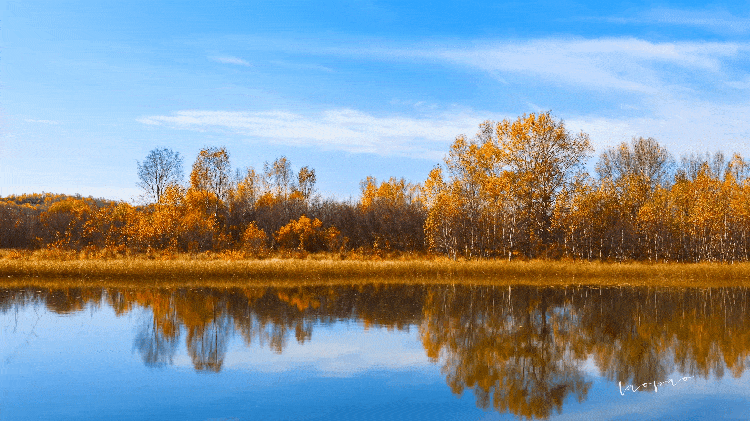 金蝉湖仿佛一面遗落在草原上的天空之镜,湛蓝的湖水中云影悠悠,倒映着湖畔金色的白桦。场景仿佛一幅生动的画卷。