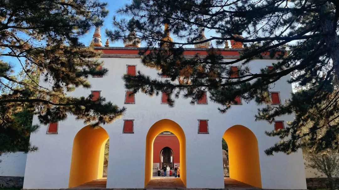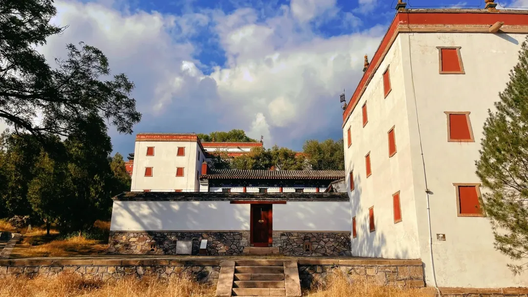 金秋时节,这座塞外山城中藏式建筑群像一颗闪亮的珍珠,安静地躺在一片松林之中。红色和白色的墙面被秋天的阳光照得格外耀眼。